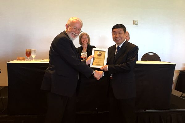 ASMR奖励委员会主席Shuman博士宣读了颁奖决定和颁奖词,介绍了胡振琪28年来在采煤沉陷地复垦、煤矸石山生态修复等矿山修复领域取得的成绩及国际影响。现任主席KimeryVories先生为胡振琪教授颁奖。胡振琪此次获奖,是得到了美国、加拿大和希腊5位专家的提名推荐和支持,并通过学会奖励委员会评审。